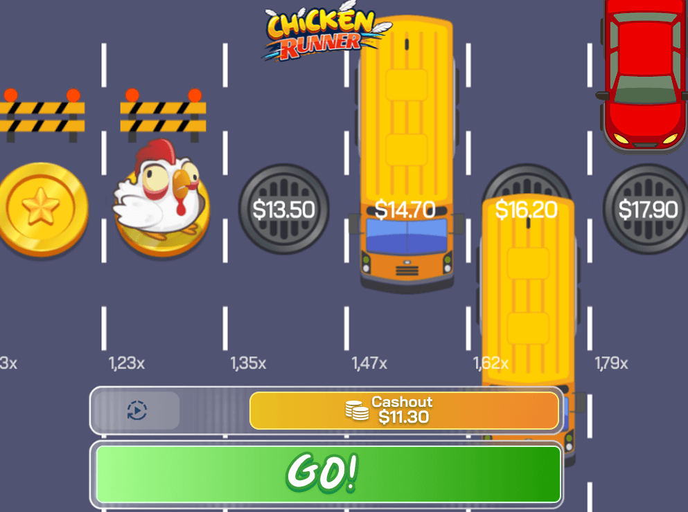 Chicken Runner brings roadside chaos to mines-style gameplay with a playful chicken theme. Guide a brave chicken across busy lanes as the multiplier climbs, choosing safe spots while dodging hidden traffic hazards. Push your luck for bigger wins, or cash out before the chicken gets hit.