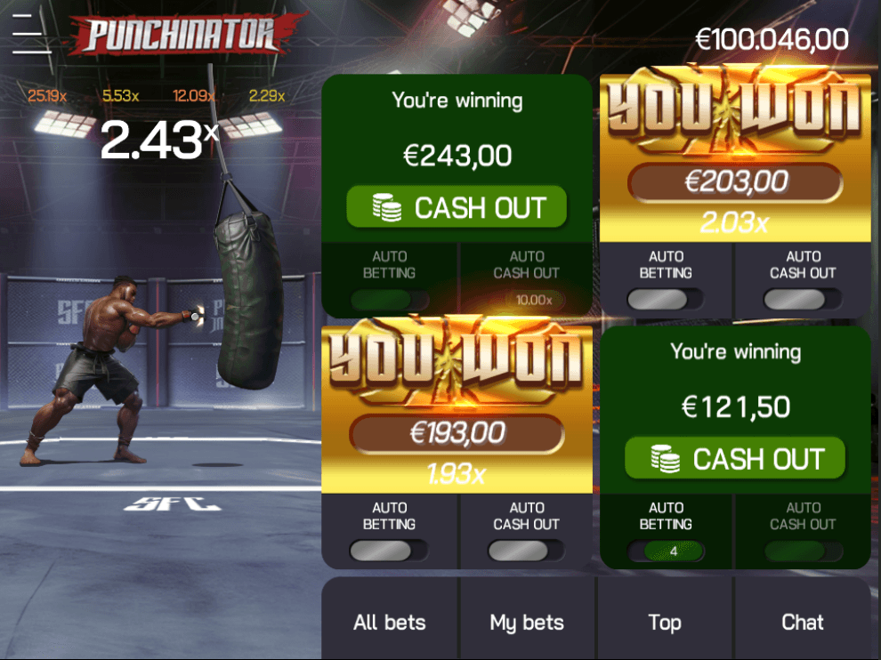 Step into the ring with Punchinator, the ultimate fighting-themed crash game! Unleash your inner warrior as you place your bets and watch the multiplier soar with every punch thrown. Will you cash out before the knockout, or will you push your luck to the max for the ultimate payout?