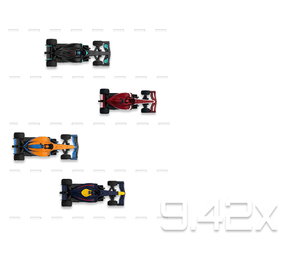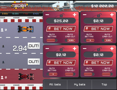 Rushinator brings racing excitement to crash gameplay with a high-speed racing theme. Four cars race side by side as the multiplier increases, with players able to place bets on up to four lanes at once. Cars crash out one by one until the winner crosses the finish line, delivering fast, competitive action and automatic cashout for the winning lane.