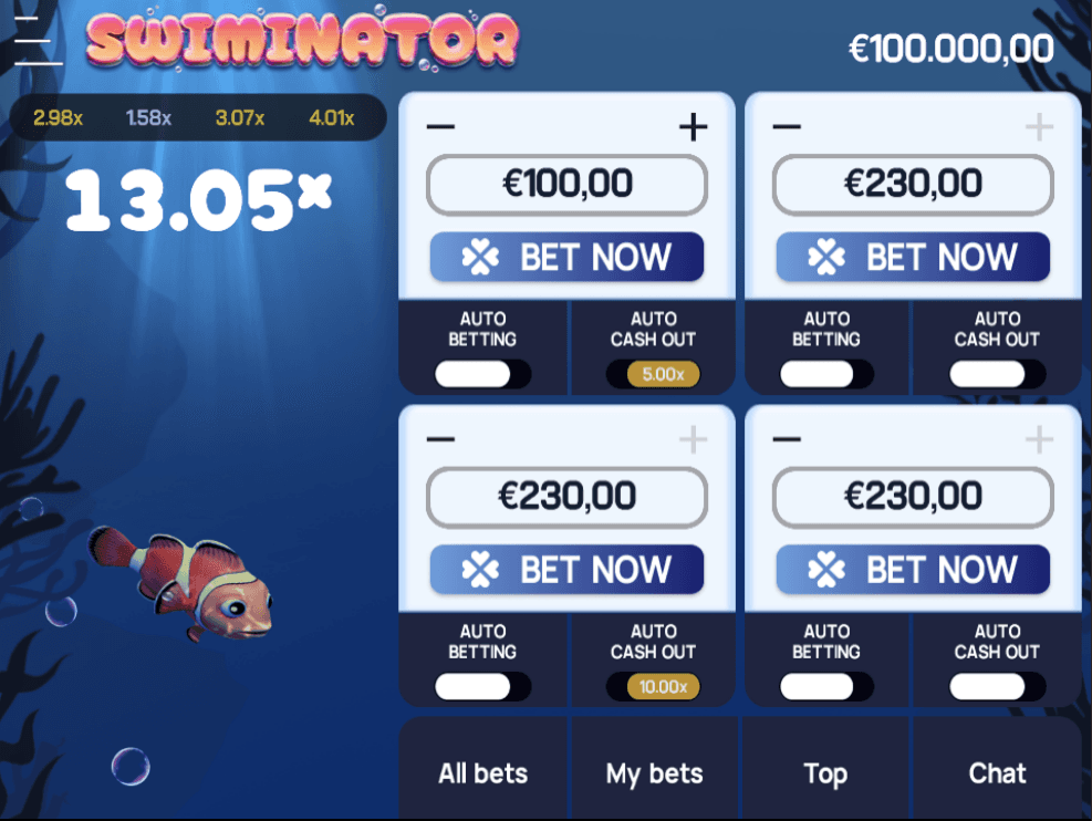 Swiminator is a streamlined casino crash game featuring four bet buttons and live chat, designed for fast, smooth play. Built to perform reliably on low-end devices and low-bandwidth connections, it ensures broad player accessibility without compromising engagement.